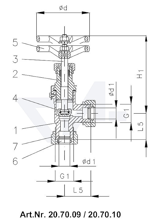 1 - Корпус CuSn5Zn5Pb5-C 2 - Головная часть G-CuSn7Zn Pb 3 - Шпиндель CuSn 6 4 - Золотник CuSn 6 5 - Маховик 6 - Врезное кольцо CuZn35 Ni 7 - Накидная гайка CuZn35 Ni |