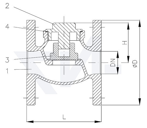 1 - Корпус CuSn5Zn Pb 2 - Крышка до DN 32 CuZn35 Ni; от DN 40 CuSn5Zn5Pb5-C 3 - Диск до DN 50 CuSn7Zn Pb; от DN 65 CuSn5Zn5Pb5-C 4 - Уплотнительное кольцо PTFE |